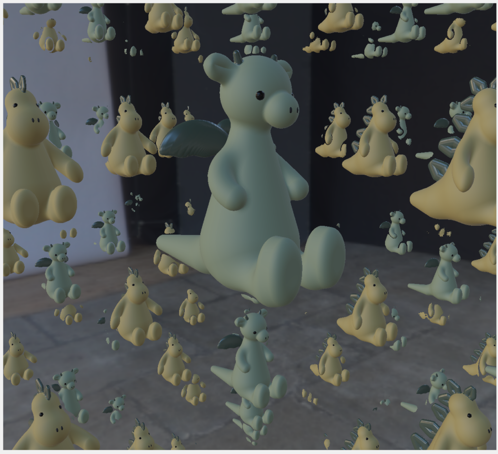 Using grid-based SDF repetition, I made infinitely repeating cells that alternate between the dragon and dino jellycats based on cell index parity.