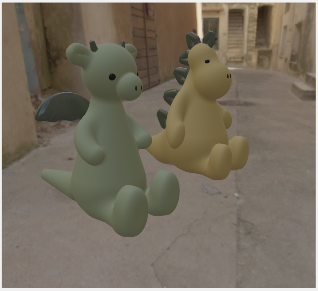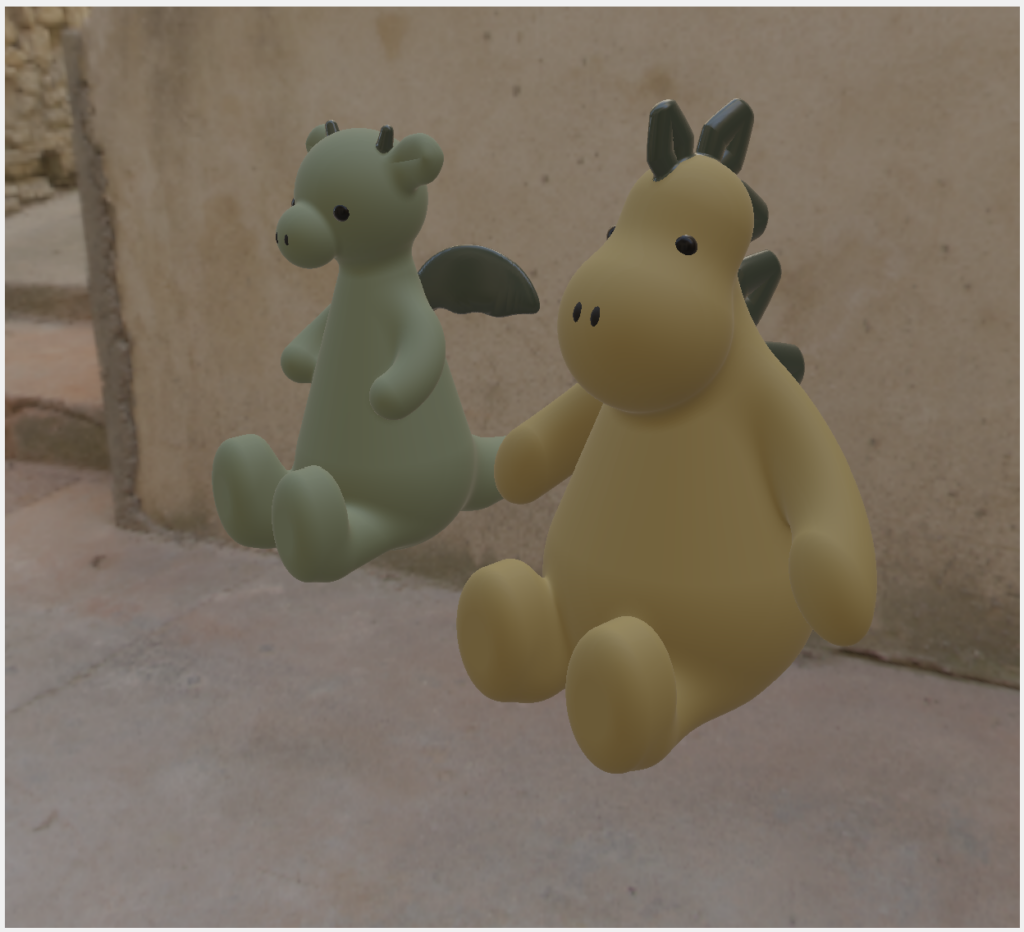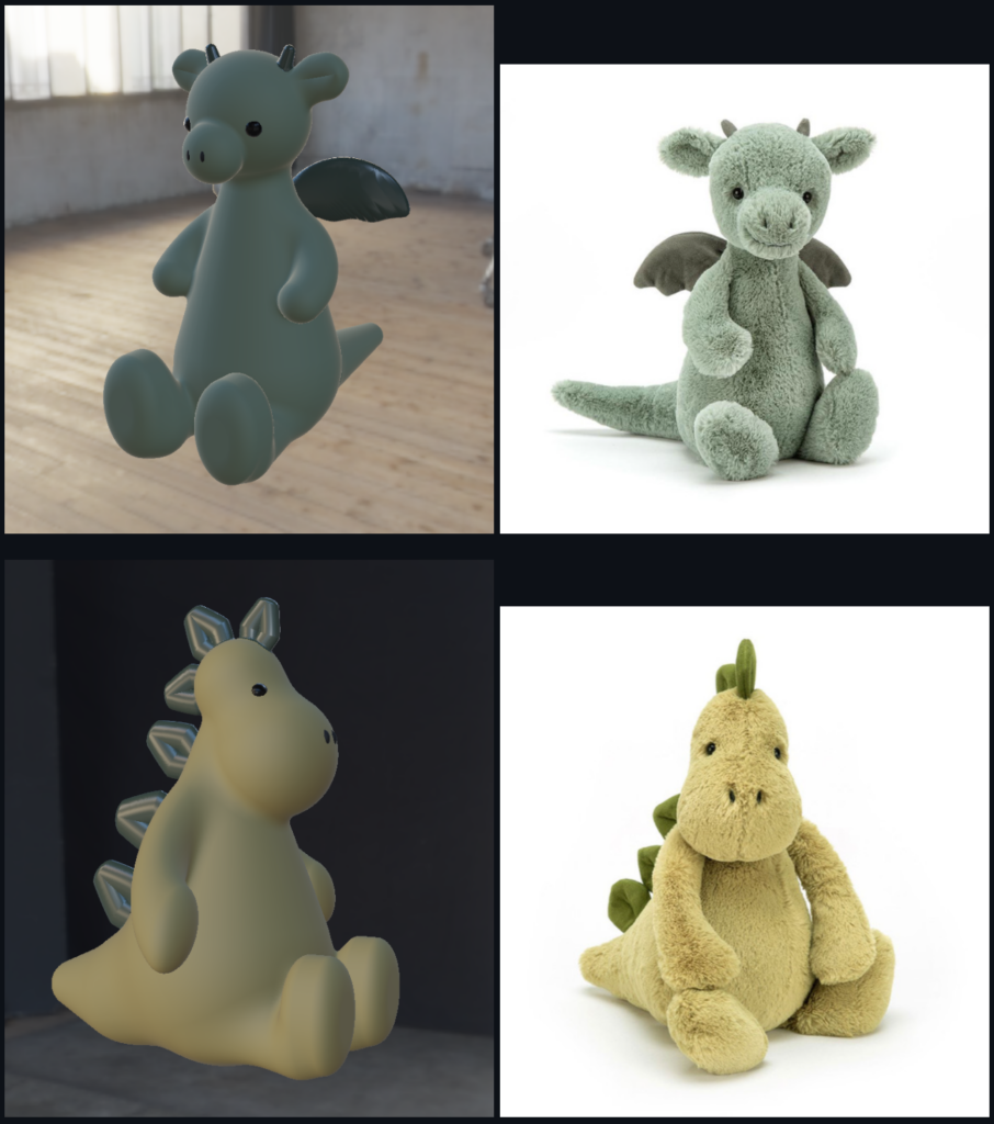 Here are the dragon and dino jellycats with their reference images. The SDFs are composed of various shapes and transformations detailed in IQ’s distance functions blog. Shapes I used include links (for the dragon ears and dino spikes), capped torus (arms), rounded cylinders (feet), and more. The jellycats also have various material properties, like metallic eyes and matte bodies.